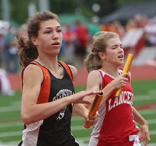Below L-R: Final exchange zone of the 4x1 with Newman Catholic [3rd, 50.60], Reedsville [Michelle Mangin handing off to anchor Meg Heafy,2nd, 50.36], and Edgar [1sr, 49.90, 49.36 in prelims, Faryn Wirkus handing off to anchor Kira Dittman.