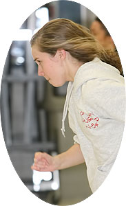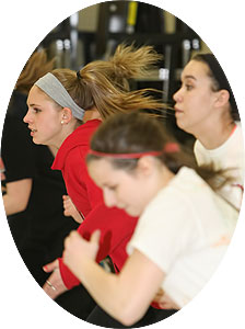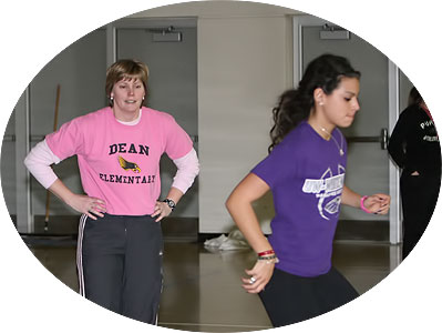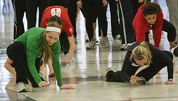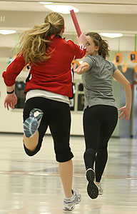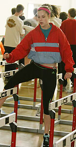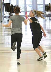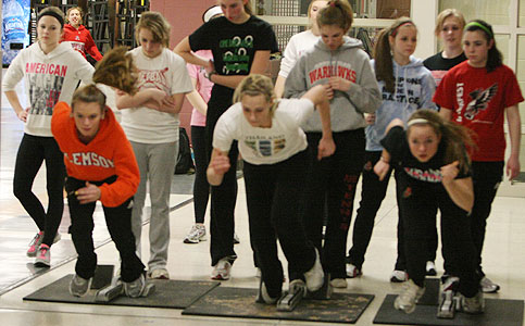 Coach Michele Olshanski [below left] demonstrates a start position as sprinters worked on starts in one of the hallways adjacent to the commons area.