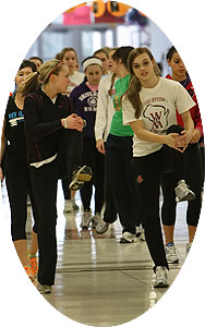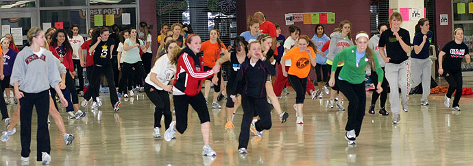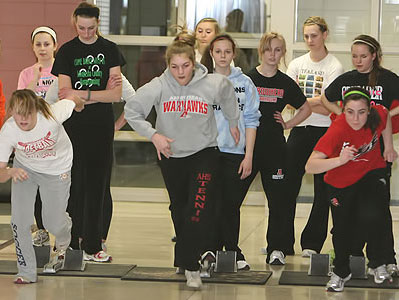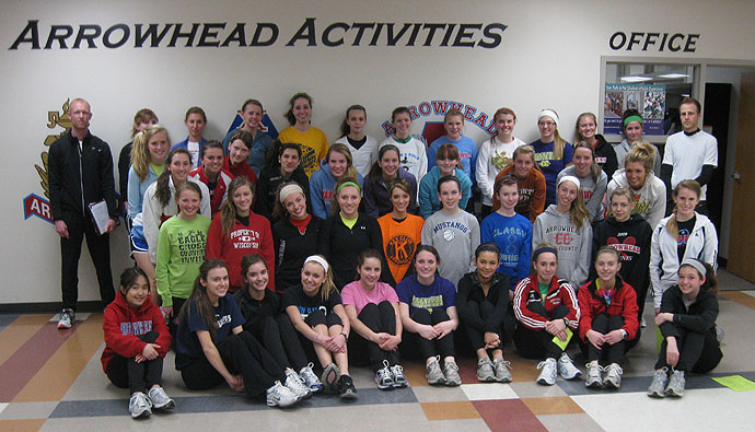 Distance runners [above] before leaving the building for their outside workout. Head Girls Cross Country coach Curt Kaczor [last row, far left] is the distance coach and is helped by Andrew Brauer [last row, far right]. Brauer is an engineer from Milwaukee who assists with the distance runners. Arrowhead finished 3rd in D1 at the 2010 XC Meet.