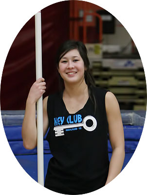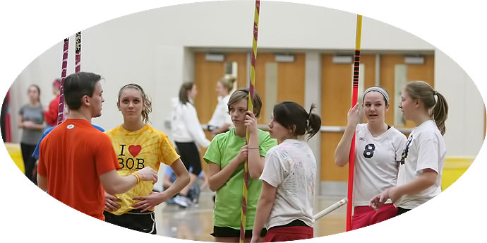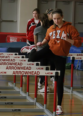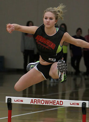 With almost 200 boys out for track it was a juggling act for coaches to work their drills into the routine in the Arrowhead Field House. Pole vault coach Chris Adrian [above, orange shirt] worked with a large group of vaulters. Cami Gilson [below] is a State Meet veteran who returns for her junior year at Arrowhead
