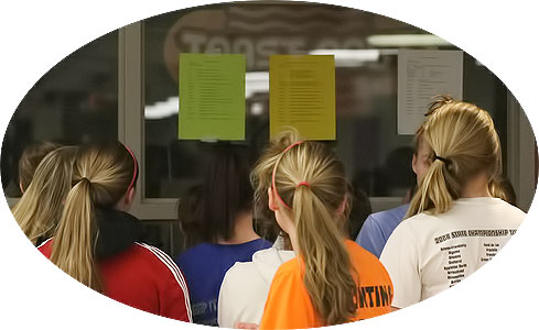 With 175 girls out for track Coach Kostka works hard to make sure each athlete will participate in a competition early in the season. With early season varsity and JV meets at Watertown, Waukesha North and UW-Whitewater that objective will be met. The girls above are checking which of the three meets they will participate in.