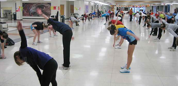 The baskeball gym was being used by the Arrowhead girls who are in the Sectional Basketball tournament. Some of the track team is pictured below warming up. The throwers were at the South Campus school gym while the distance runners had left for their outside run.