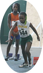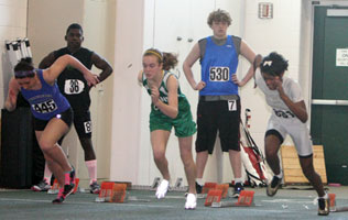 Above: Wings of Glory athletes in the youth 55m dash. Right: Mustang dash athletes: Right center-South Milwaukee sophomore Micaela Creighton. Far right-Demetra Camble a senior at Milwaukee Riverside.