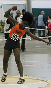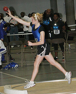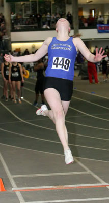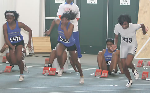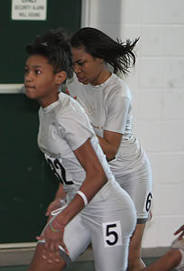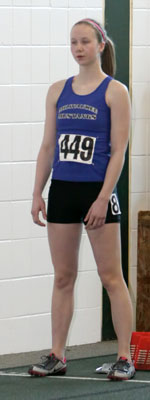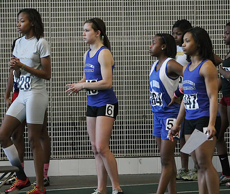 L-R: Tierra Brown [Wings of Glory, senior at Milwaukee Lutheran], Danielle Barbian [Mustangs, senior at Sussex Hamilton], Briana Carter from Kansas City, and Dezerea Bryant [Mustangs, senior at Milwaukee Bradley Technical]. The athletes above ran in the 55m dash [Women - Young (18 and under)]. The Northern National Indoor record in the 55m dash was 6.96 set in 2008 by Alishea Ursery from St. Louis. Bryant broke this record in her preliminary heat [above] by blazing to a 6.89 clocking. In the 55m dash women-young finals Bryant set another record with a 6.86 time and a first place finish. Tahje Whittley was second in 7.13, Danielle Barbian 7th in 7.37, and Angelina Howard 8th with a time of 7.42.