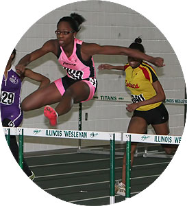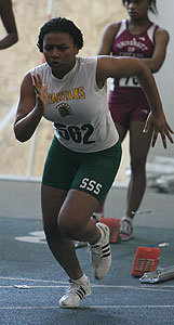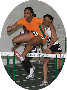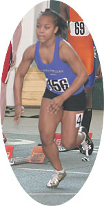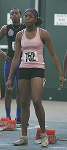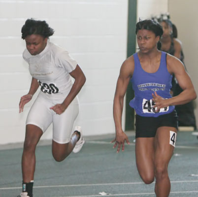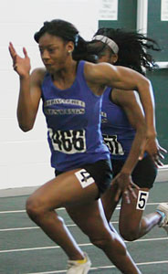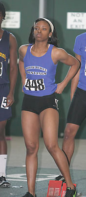 Above L-R: Tahtyana Peer [Mustangs,sophomore from Brown Deer], Tahje Whittley [Mustangs, senior from Milwaukee Bradley Technical], and Crystal Malone [Wings of Glory, sophomore from Milwaukee Riverside]. Above right: Tahje Whittley in the 55m prelims. Whittley was 3rd in the 400m finals [58.68].