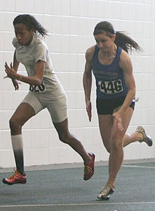 Above: Brown and Barbian in heat 1 of the Women's [young] 55m dash prelim. Right L-R: Brown Deer senior Ariel Kinlow [Wings of Glory from Milwaukee], Angelina Howard [Mustangs, senior at Milwaukee Bradley Technical].