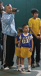 Left: A father and two of his children watch a family member run the 800m race. The athlete on the right is in the 'primary' class [born 2003 or later], the youngest class of athletes in an AAU track and field meet.