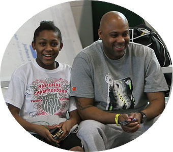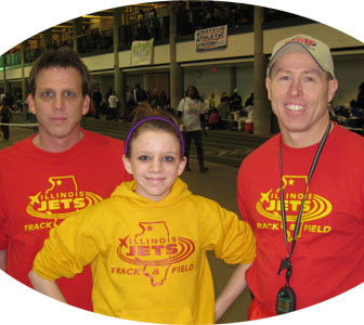 Above left: A father and daughter from the Chicago area enjoy a break while waiting for her event. Above right: A father from the stateline area [far right] and his daughter and a coach from the Illinois Jets wait for the HJ event to begin. The jets have team members from the Rockford area up to the state line with Wisconsin.