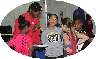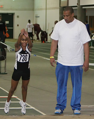 The young athlete on the right from Mullica Hills, New Jersey, was a National Champion last year. Over the past year she has grown 4 inches. A friend of the family from Seattle traveled to the meet and was giving her coaching pointers prior to her event.
