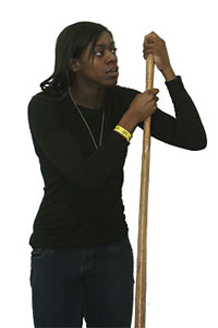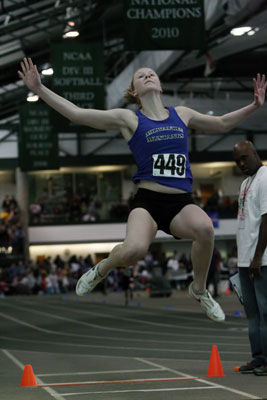 Above: Brookfield Central D1 State LJ Champion Chidera Obasih helps in the pit as Mustang athlete Micaela Creighton [sophomore, South Milwaukee] competes in the LJ. Creighton won the Women-Young LJ with a distance of 17' 11.