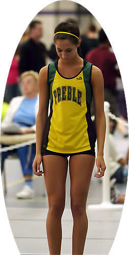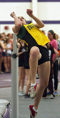 Above: Green Bay Preble HJ athlete Meagan Hilla [5th, 5' 00].Right HJ winner Hailey Valentine concentrates prior to an attmept. Valentine is a sophomore at Green Bay Preble and won the event with a jump of 5' 02. |