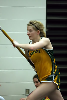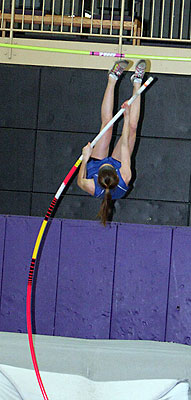 Wrightstown [D2 school located about 1/2 way between Green Bay and Appleton] vaulter Bonnie Drexler [above] while only a ninth grader announced her arrival on the high school track scene in an impressive way. She more than held her own in the dash competition and then proceeded to vault 11' 07 to win the PV competition..