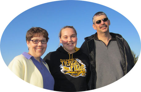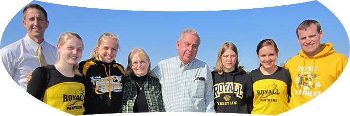 Above L-R: Royall High School principal Jeff Van Lannen, Royall student athletes Hana Weber and Madeline Miller, the Brunner's Barb and Ron, Royall student athletes Katie Sugden and Emma Zmolek, and Royall Schools District Administrator Mark Gruen.