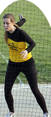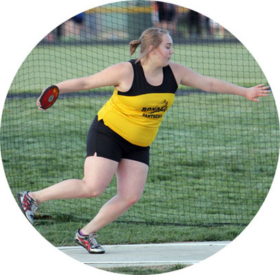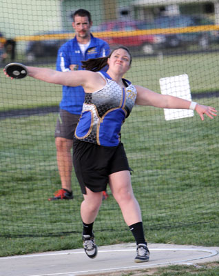 Right: Royall's Megan Conley [Royall, 2nd] in the discus. Below L-R: Kim Buchholtz [Royall] and Erin Hauck [Mauston, 3rd].