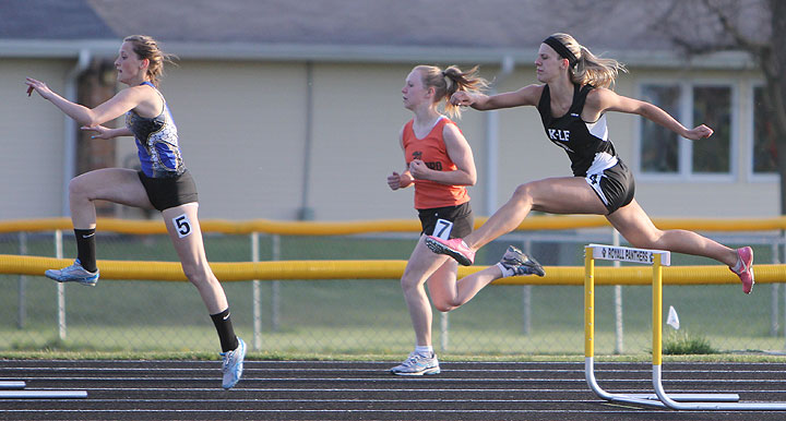 Below 300m hurdlers L-R: Tiara Hoffman [Mauston, 2nd], Leeta Russel [Hillsboro], and winner Taylor Sherry [Kickapoo-La Farge, 48.40].