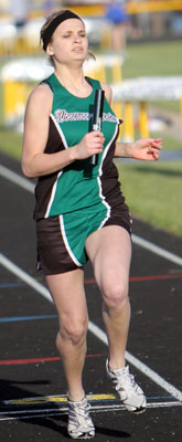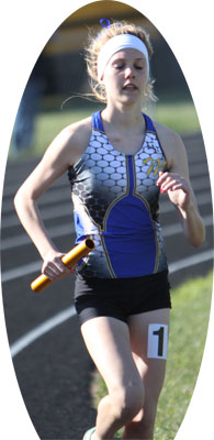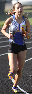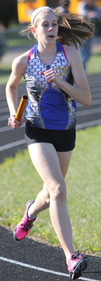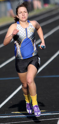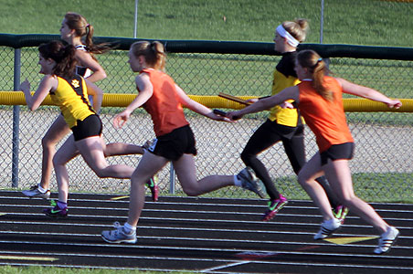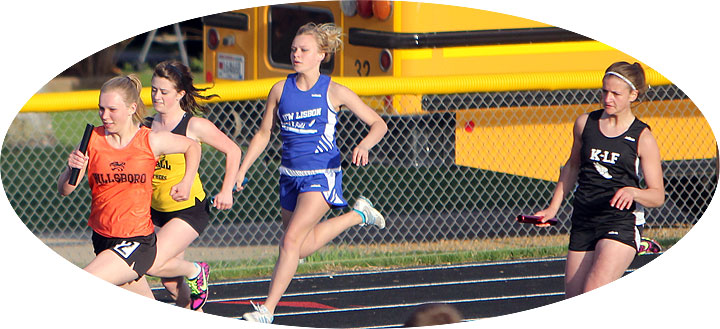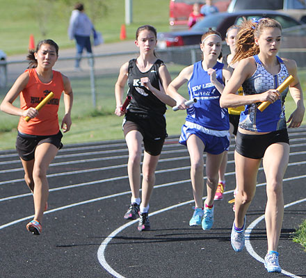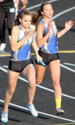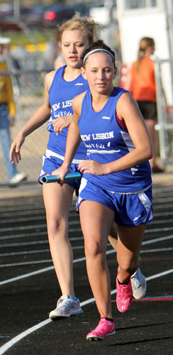 Left: New Lisbon relay runner Breanna Borchardt hands off to Katie Kalmerton.