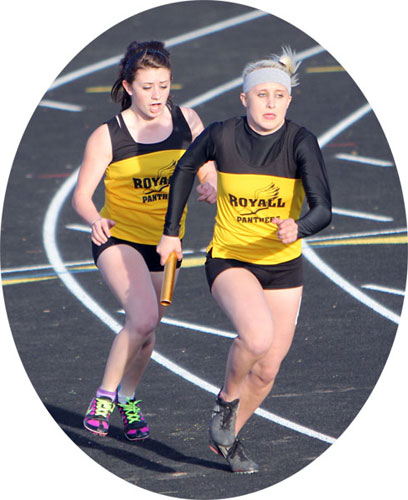 Below Left: Royall 4x1 relay team runner Cara Masters hands off to anchor Bria Altamore.