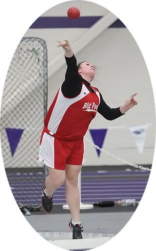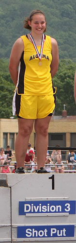 Algoma sophomore Kennedy Blahnik [above] is the defending D3 SP Champion. In her first year at La Crosse she set a State Record in the D3 Shot Put with a distance of 47' 00.25. At the UW-Oshkosh Small Schools Meet on Tuesday, March 27, 2012, she won the SP event with a throw of 45' 10.50.