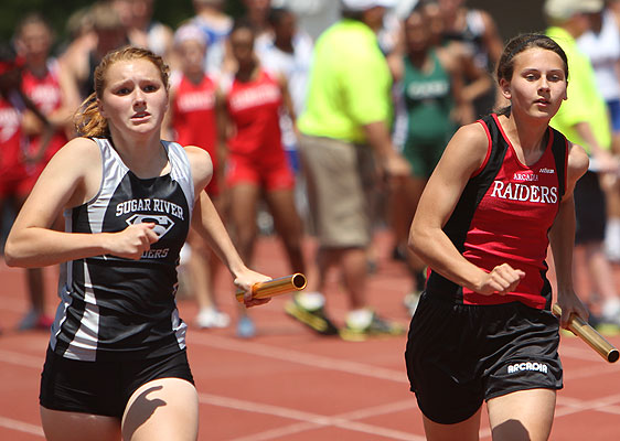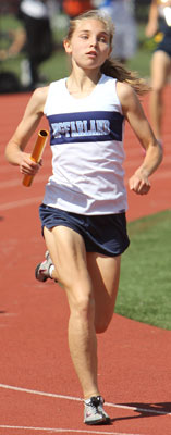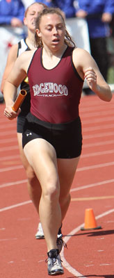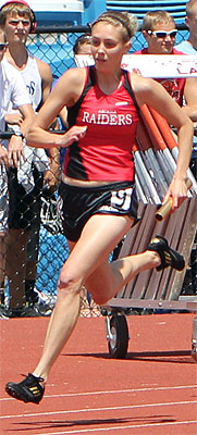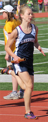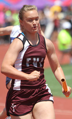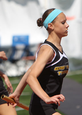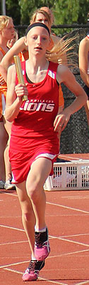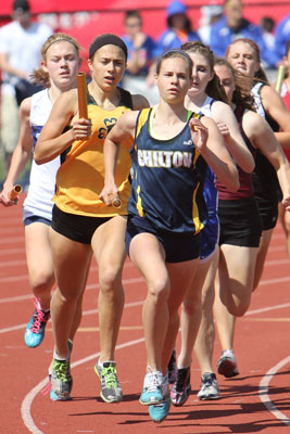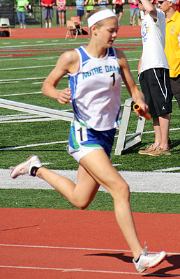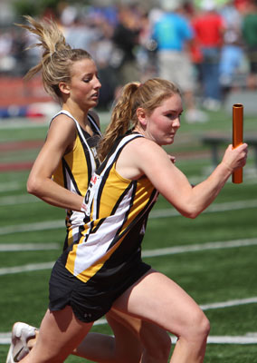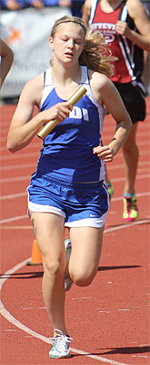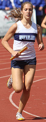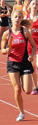 Left: Hayward leadoff 4x8 runner Aly Tremblay [10] hands off to teammate Ricki Lee [12].