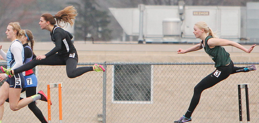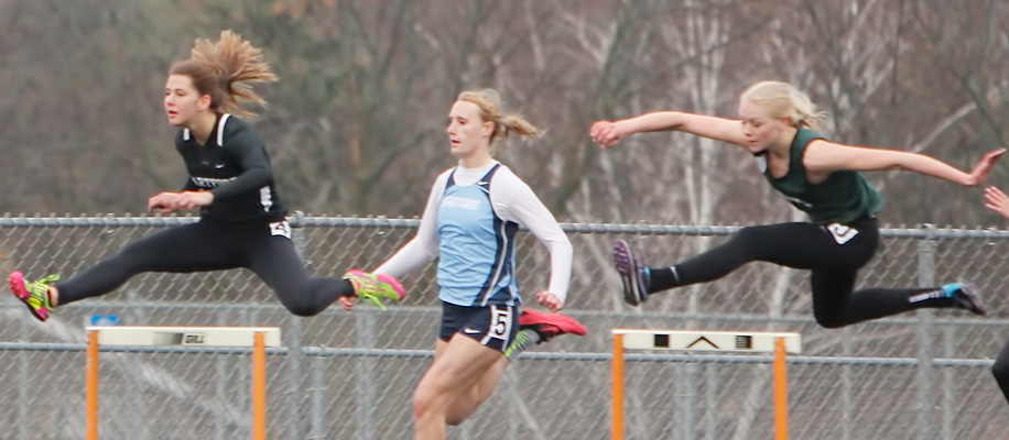The 300m LH race was one of the highlight races at the meet. In the backstretch view above L-R are: Celina Wanta [#5, West Bend West, 3rd, 48.38], Hannah Mertens [#4, Hartford Union, 2nd, 48.01], and winner Kari Schneiss [#3, Kettle Moraine Lutheran, 47.66].