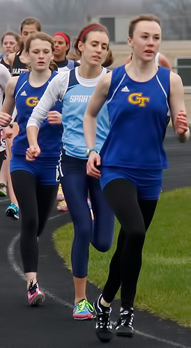 Left: 1600m runners L-R: Molly Baus [Germantown [3rd], Kyra Gudex [West Bend West, 1st], and Khia Kurtenbach [Germantown, 2nd].