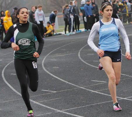 Above right: Finish of the 1600m race with West Bend West runner Kyra Gudex [left] edging Germantown's Khia Kurtenbach [right] 5:23.36 to 5:24.18.