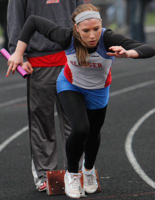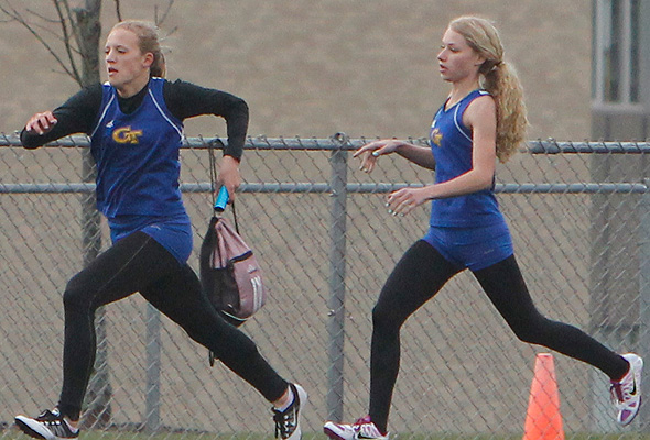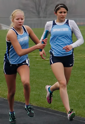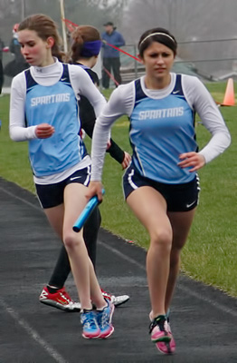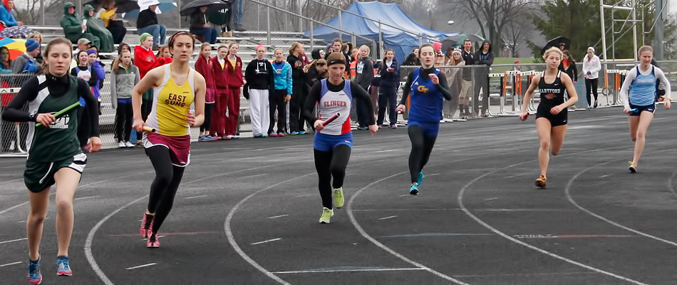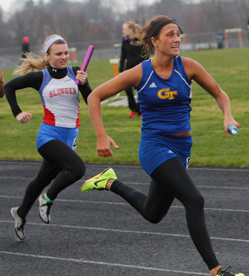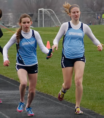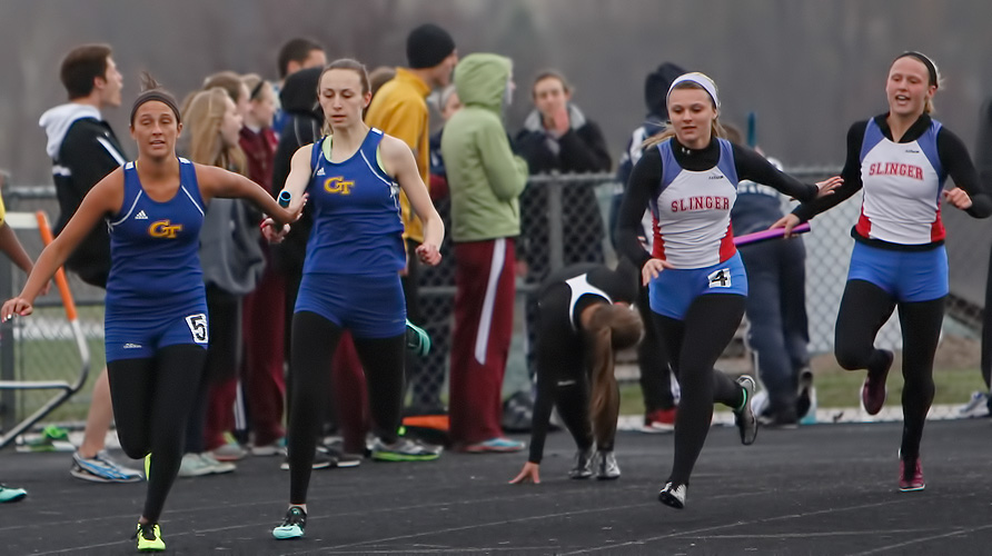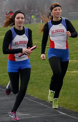 Above left 4x1 anchors L-R: Katelyn Kelly [Slinger] and Jayne Bertieri [Germantown]. Above right: Germantown's Erika Bethhauser hands off to Kenzie Schmitz in exchange zone 1 of the 4x1.