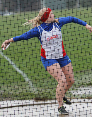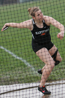 Above right: Hartford Union sophomore Sam Noennig shown in the discus event was second in the SP [39' 03.50].
