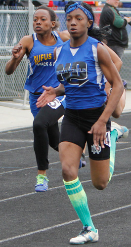 Above 100m dash athletes in the prelims L-R: Mariah Williams [2nd, King] and Drea Johnson [4th, North Division].