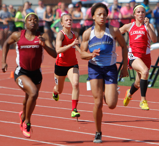 Above left: Gabby Beauvais won all three dash events in D1. She is shown above left in the 200m dash which she won in 24.32. Above right finals of the 200m dahs L-R: Jackie Baldwin [2nd, Kenosha Bradford], Grace Hartman [6th, Wisconsin rapids], Beauvais, and Tore Washa [5th, La Crosse Logan].