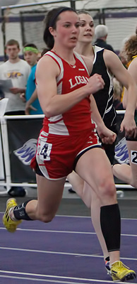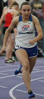 Above prelims L-R: Jaliyah Elliott, Kaitlin Splittgerber [Xavier], Jessika Dieringer [Ozaukee], and Tanesha Davis [4th, Racine Horlick]. 73 dash athletes ran in the 55m dash event.