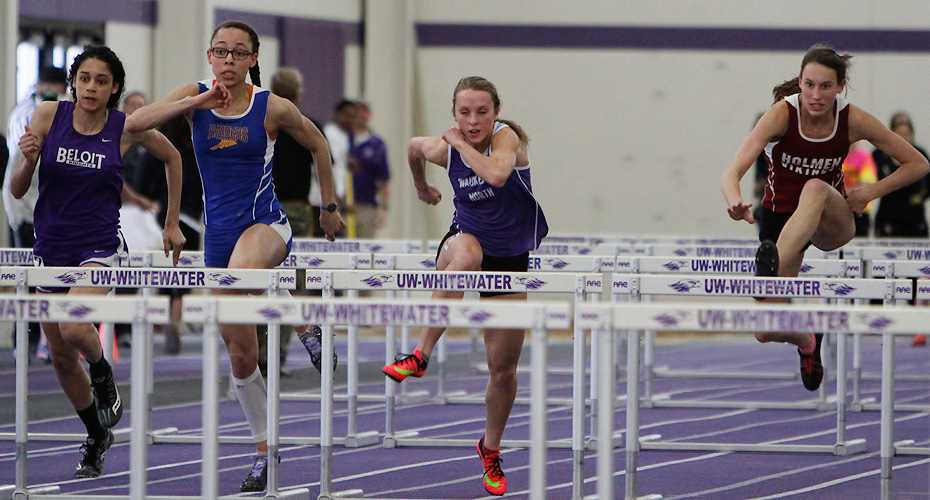 55 high hurdel finals L-R: Eva Laun-Smith [7th, Beloit Memorial], Monique Felix [2nd, Sheboygan North], Madison Ricciardi [5th, Waukesha North], and winner Danielle Kohlwey [8.38, Holmen].