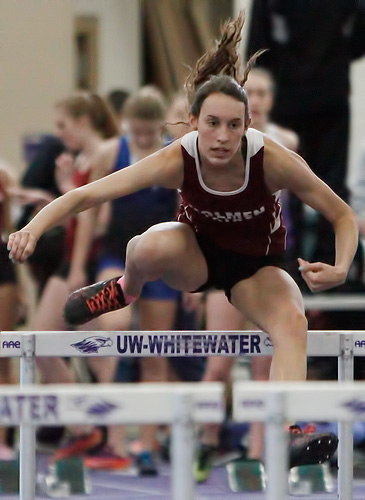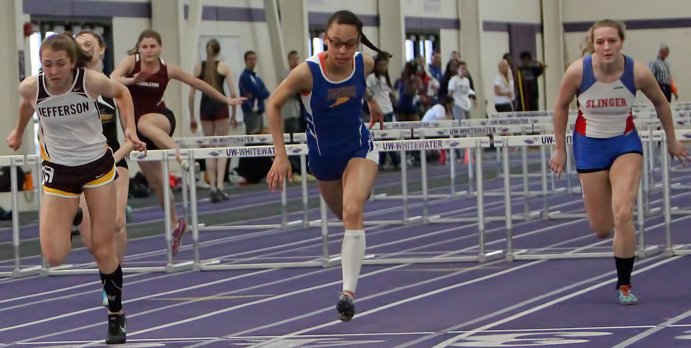 55m HH prelims L-R: Sydney Faehling [West Bend West], Madison Ricciardi, and Savannah Callen [Mernomonee Falls]