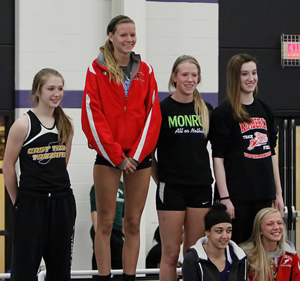 Above right HJ athletes top row L-R: Hope Schneider [2nd, East Troy], winner Tierney Lindner [5' 07, Sun Prairiue], Jordan Hirsbrunner [3rd, Monroe], and Amber Chevalier [3rd, Kimberly]. Bottom row L-R: Raeven Peek [3rd, Beloit Memorial] and Stephanie Sawicki [3rd, Chippewa Falls].