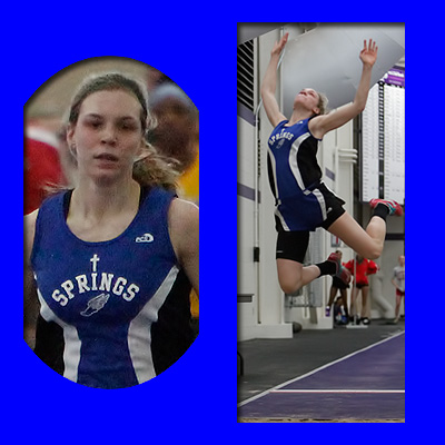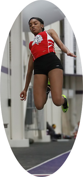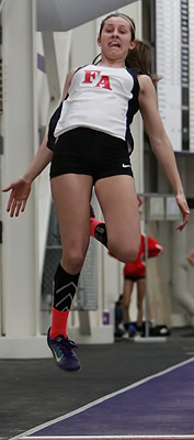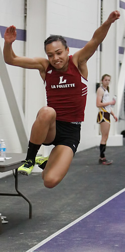 Right: LJ Champion Nadia Williams a junior from Mount Horeb [18' 03]. Williams winning jump is shown on the right .