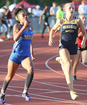 Wausau West sophomore [L] Brooke Jaworski broke the 400m dash record of 54.33 which she set at the 2016 State Meet with a time of 54.27 in the prelims. In the Saturday finals on an extremely hot day she turned on the afterburners and set a record with a time of 53.71. A talented field behind her also turned in outstanding times.