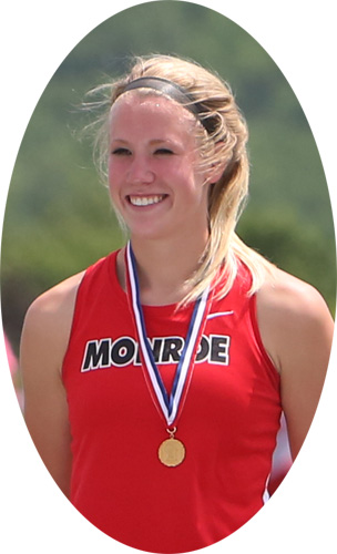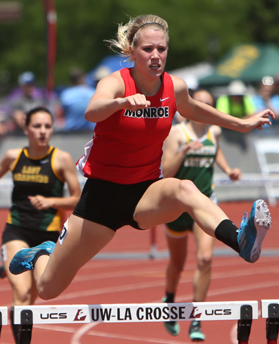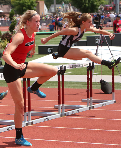 Monroe senior Jordan Hirsbrunner won both hurdle events in D2. Hirsbrunner [far left] recorded a 15.28 to win the Gold in the 100m HH. Krista Diaz [left] from Belleville/New Glarus won the Silver Medal in the 100m HH.
