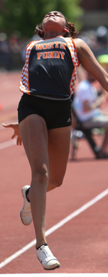 Senior Mikayla Brouette [right] who competes for the Bulldogs of Pardeeville HS had her best jump of 37' 09.25 on her 2nd try in the finals to win the Gold Medal in the TJ event.