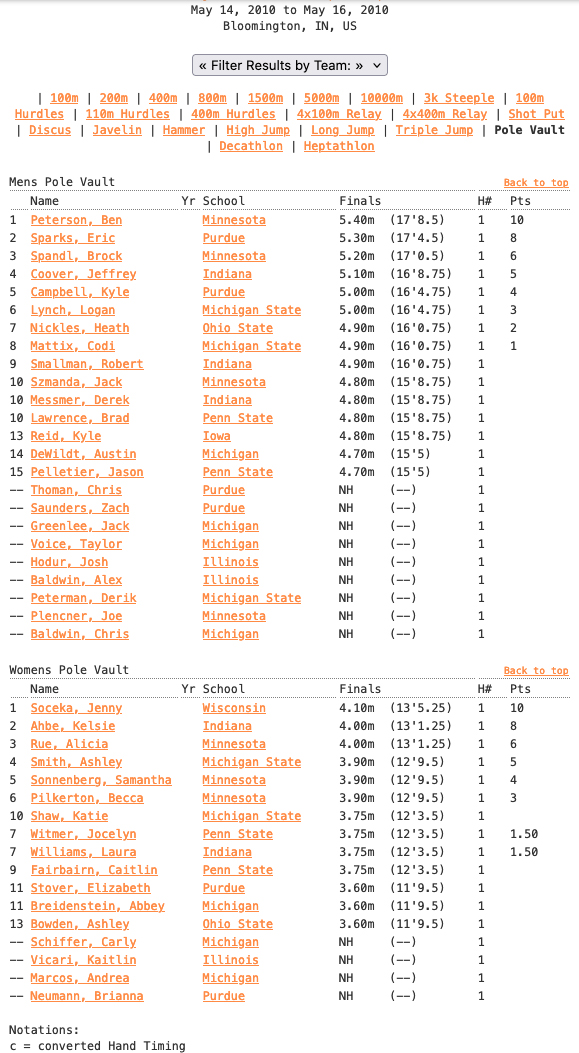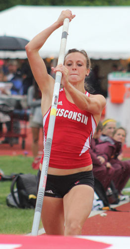 Jenny Soceka Wins Big Ten 2010 Pole Vault Gold Medal Former Madison Memorial athlete Jenny Soceka won the 2010 Big Ten Outdoor Pole Vault title with a vault of 13' 05.25. The Badger athlete helped the women to a third place Big Ten finish. Photographs by Brian Mason |