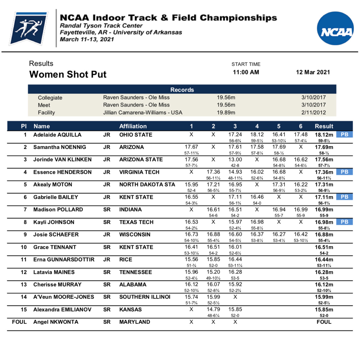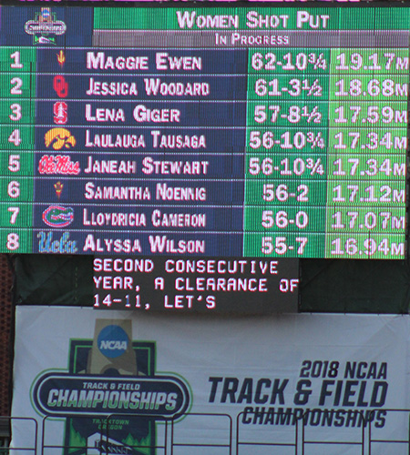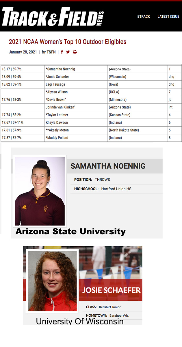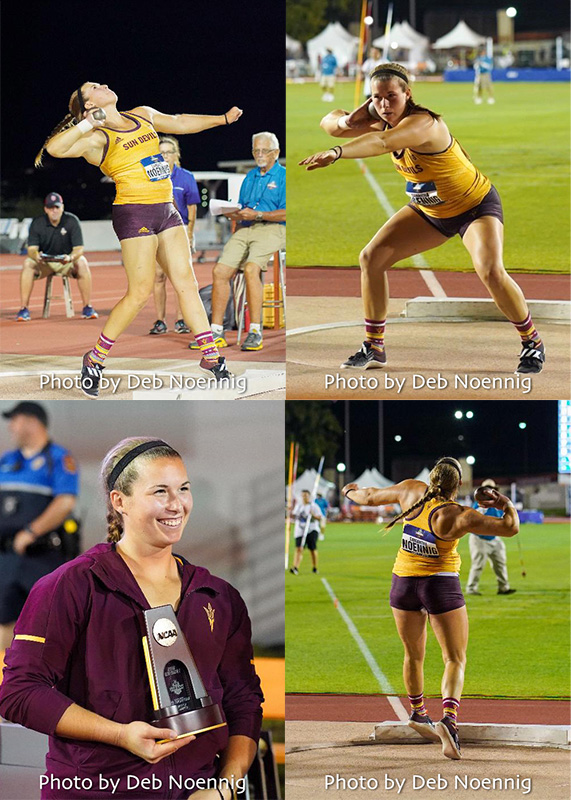 Former field athletes from Wisconsin made their mark at the 2019 Outdoor NCAA Track And Field Champoionships held at the University of Texas, Austin, TX. Hartford Union graduate Samantha Noennig [photos above] competing for Arizona State University won the outdoor event [59' 06.25]. Arizona State Link | NCAA Result. Wrightstown graduate Bonnie Draxler competing for San Diego State University was the Silver Medal winner in the pole vault [14' 09.50, currently 27th in the World]. She is an automatice qualifier for the Olympic Trials. San Diego Link | NCAA Result. Shot Put Photos above by Deb Noennig. |