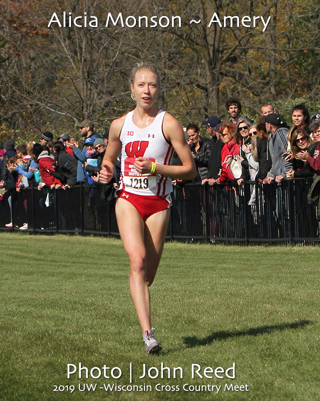 Former Amery runner Alicia Monson [Class of 2016] who made history as a runner for the Badgers of UW-Wisconsin has qualified for the 2021 Olympics in the 10,000m run. John Reed's photograph shows Monson running for the Badgers at a home cross country meet. |