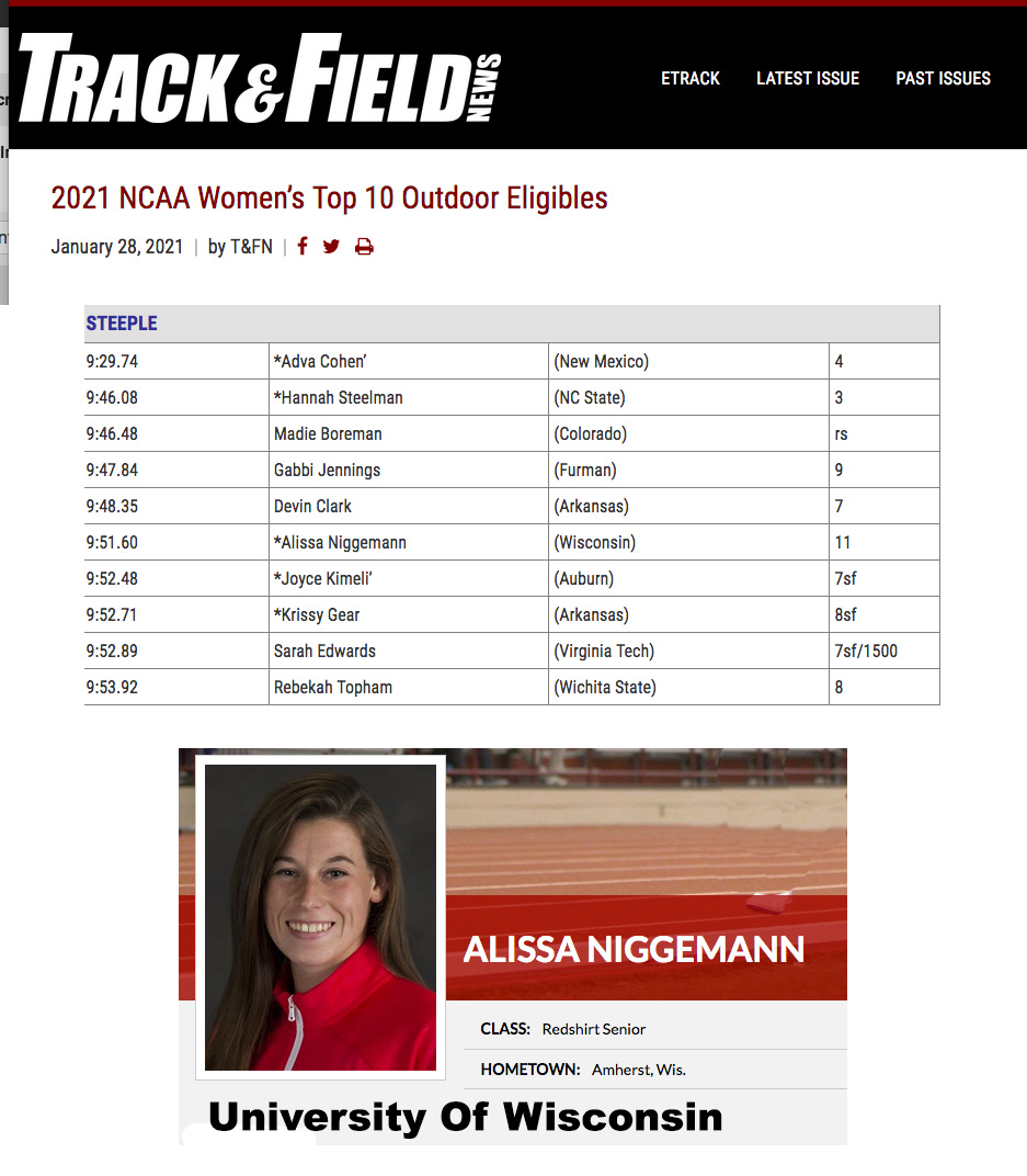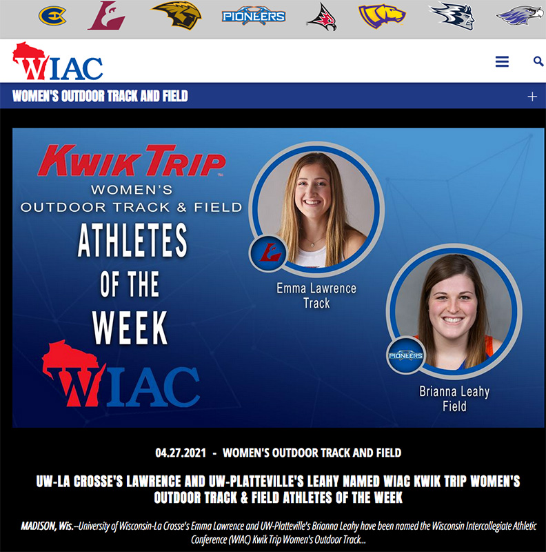 Above left: Former Brookfield Central teammates [Class of 2011] Hannah Trasser [University of Minnesota] and Kara Krugel [University of Wisconsin] are pictured [Friday, February 8] at the 2013 Cyclone Classic held at Iowa State University on Friday-Saturday, February 8-9, 2013. Photo on left by M Krugel Above right: University of Wisconsin-Platteville senior Ann Tank [Dodgeville/Mineral Point class of 2008] became the 12th Pioneer student-athlete to be selected for Capital One Academic All-American Team honors as selected by the College Sports Information Directors of America (CoSIDA) on Tuesday. The Dodgeville, Wisconsin native was named to the third team qualified all four years of her track and field eligibility for both the NCAA Indoor and Outdoor Championships. On the indoor circuit, she earned All-American twice in the 800-meter run and two more times as a member of the 4x400-meter relay. On the outdoor circuit, she was a member of three relays that earned All-American honors and once in the 800-meter run Photographs used with permission of Danny Kambel, Sports Information Director at UW-Platteville. . |