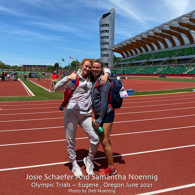 Former D1 Wisocnsin High School throw State Champions Josie Schaefer [L, [Wisconsin] from Baraboo and Samnatha Noennig [R, Arizona State | Arizona] from Hartford Union are shown at the Olympic Trials at Hayward Field in Eugene, Oregon. They both competed in the Shot Put event. |