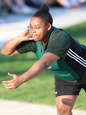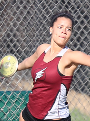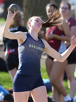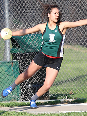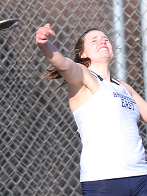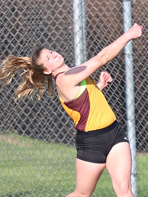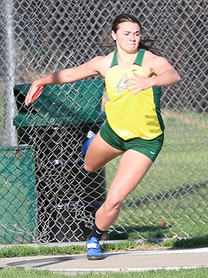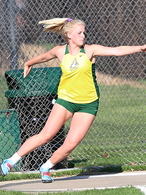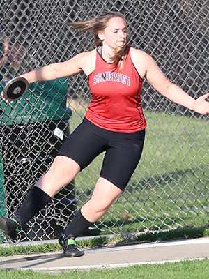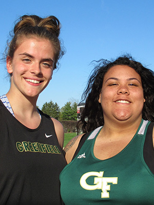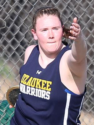 | Above left: Ozaukee senior Emma Richards won the discus with a season best Honor Roll throw of 154' 10. Above right: Sophomore Eve Goldstein from Somerset launched a throw of 44' 01 on her second attempt in finals to win the SP competition. |