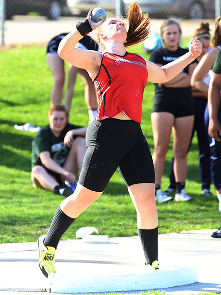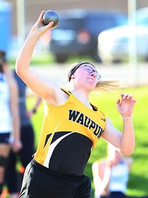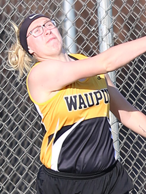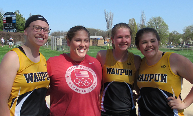 | The Waupun throw team is shown with Kelsey Card. Waupun members L-R: Sydney Flier, Claire Bresser, and Kelli Bonack. | ||
