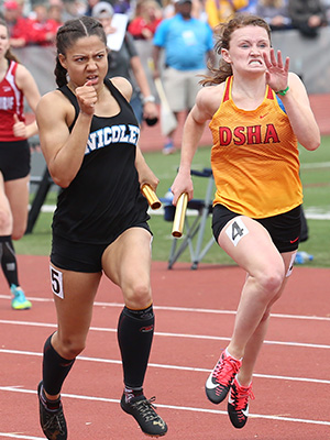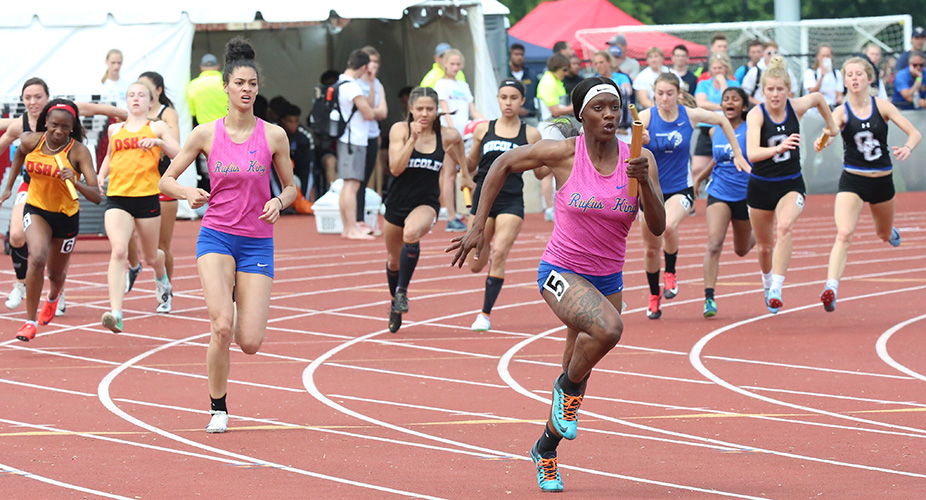 | Rosie Cramer looks on as anchor Makayla Jackson jets to the finish line and a 46.70 [46.54 in prelims] clocking earning Milwaukee King the Gold Medal in the 4x100m relay | ||