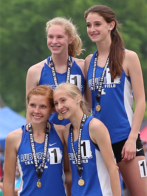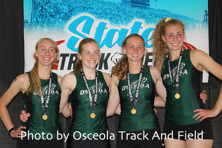 | The D2 4x8 Gold Medal winners from Osceola posted a 9:30.69. Runners above L-R: Alli Fogelberg, Lauren Ellefson, Caroline Gearin, and Katie Haase. |