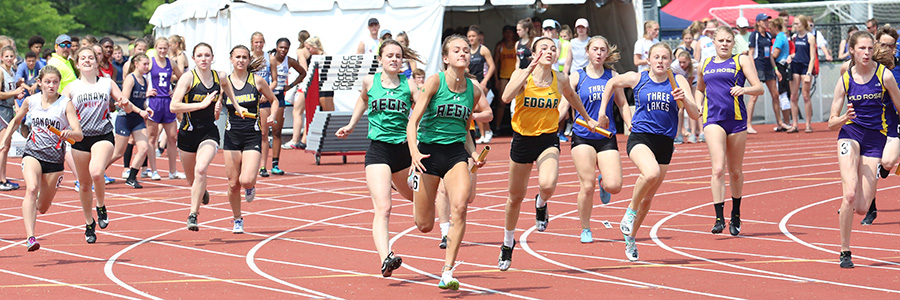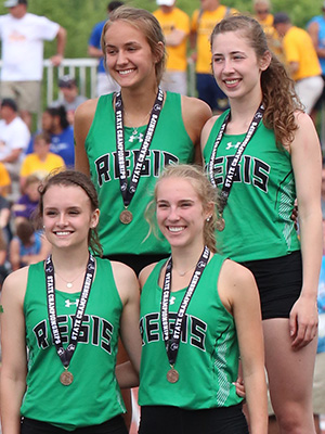 | Three Lakes/Phelps anchor Kortnie Volk has some ground to make up at the final exchange of the D3 4x1 race. Three Lakes nosed out Manawa 50.32 to 50.42 for the Gold Medal. Manawa anchor Aspen Linjer [far left] turned on the jets to surprise everyone with a second place finish . Manawa had qualified 8th for finals. Regis finished third- Regis anchor Bria Thalacker is shown getting the baton from Josie Stender. | ||