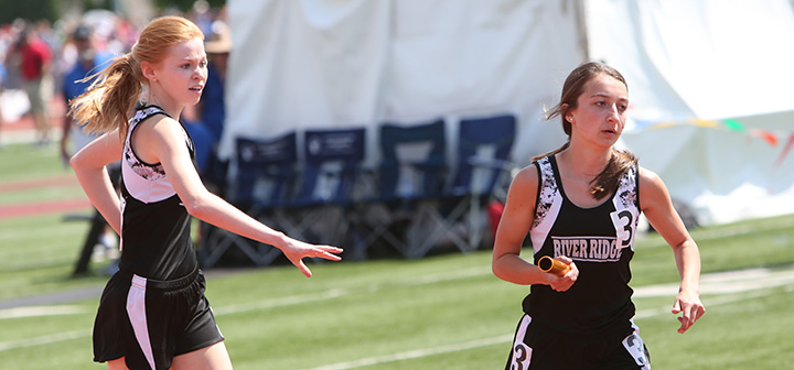 | Anchor Faith Schier takes the baton from leg 3 4x800m runner Riley Klein at the 2017 WIAA State Meet | ||