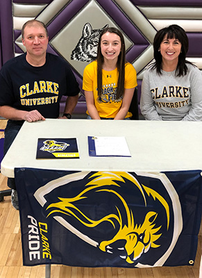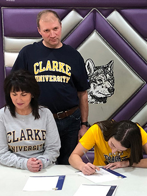 | Left: Faith Schier signs her National Letter of Intent to compete at Clarke University. Right: Faith's parents Bill and Kristin. | ||